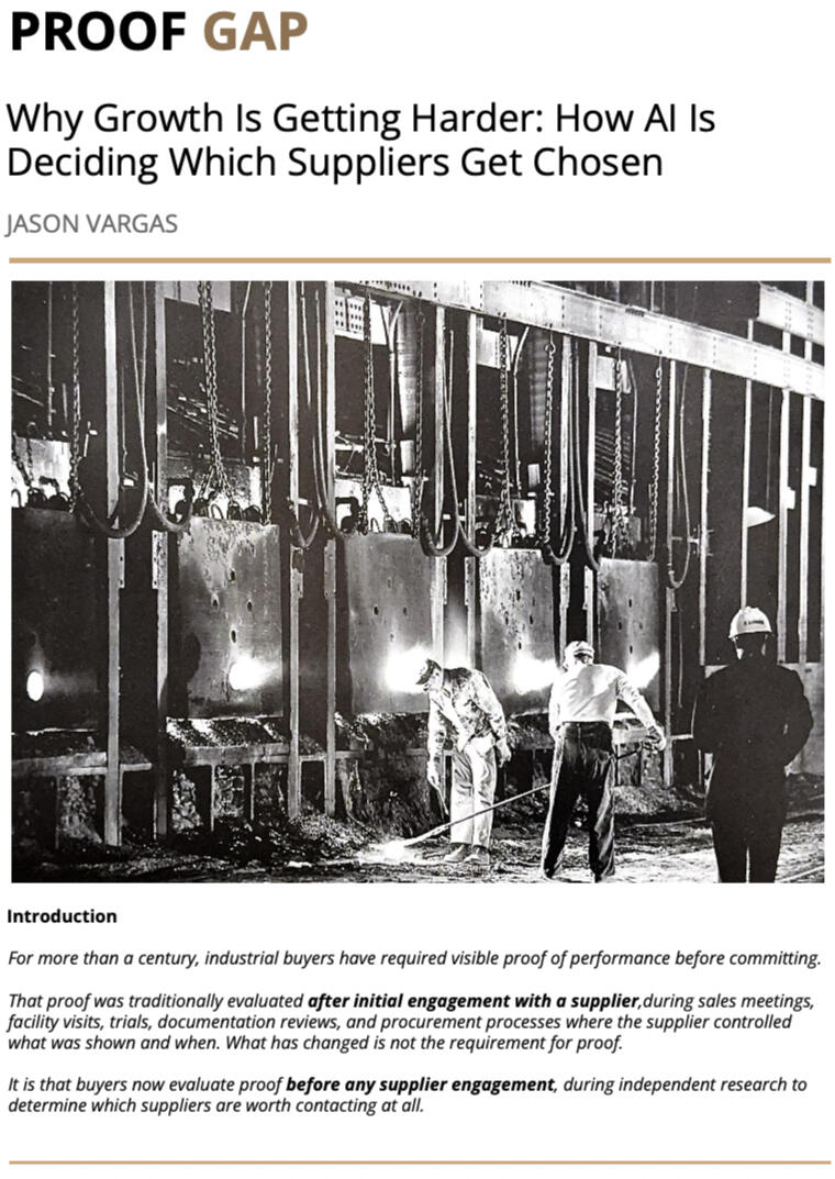 The Proof Gap explains why capable industrial and B2B companies are increasingly excluded before sales is ever contacted—even when their products, teams, and performance remain strong.The paper examines what has changed in buyer research, how many organizations react by increasing activity or messaging, and why those responses often overcorrect and fail to restore consideration. It concludes by reframing the issue as a leadership decision and outlines what leaders must do differently to remain visible and credible while buyers decide who to trust.